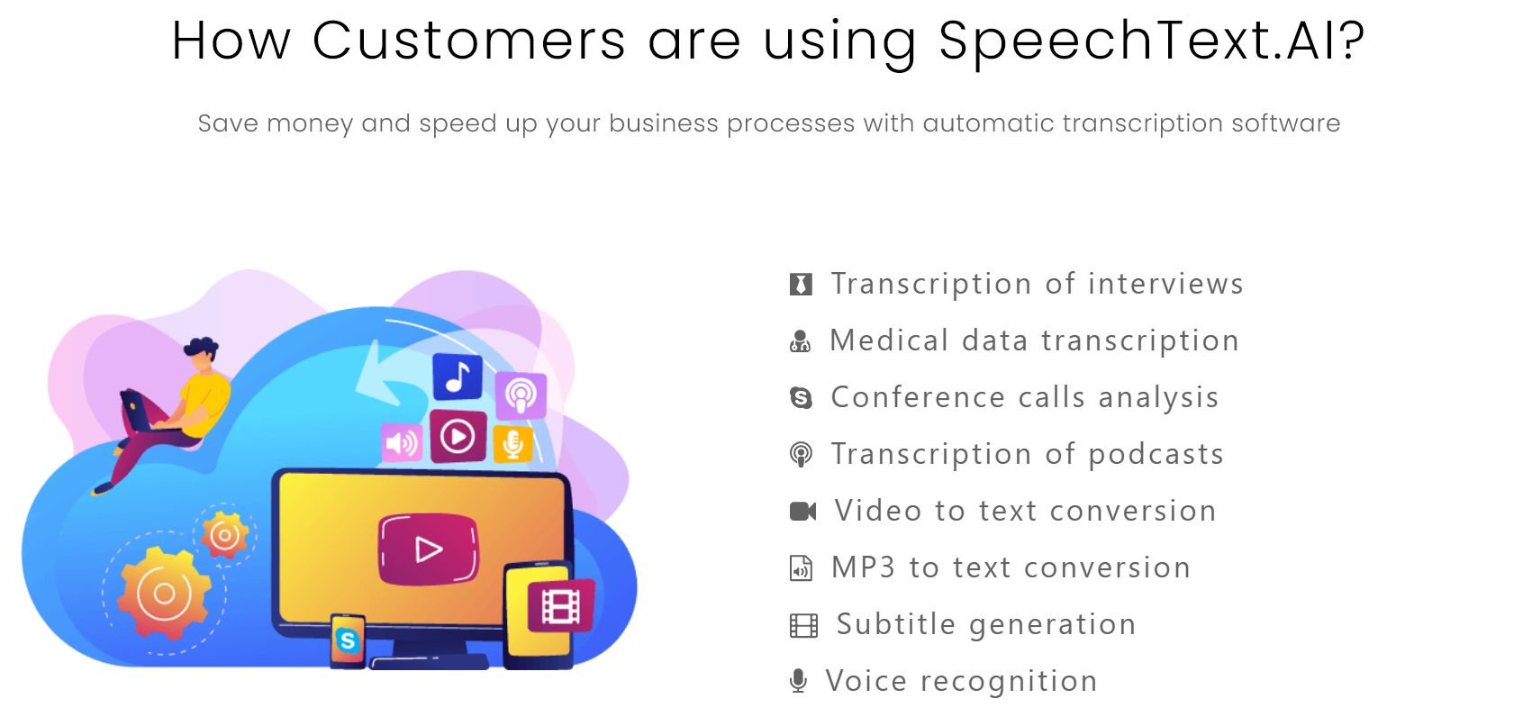 SpeechText AI 에서는 의료데이터기록 이나 스카이프의 전화 회위 분석 팟캐스트 녹음을 포함한 다양한 플랫폼과 비디오부터 텍스트 까지 아주 다양하게 사용이 가능 합니다.