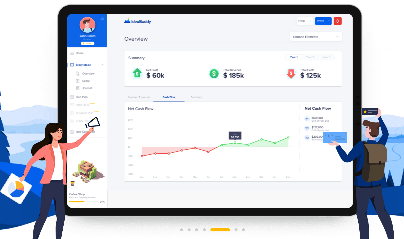그 아이디어로 만든 사업계획서가 얼마만큼 가치를 가지는지 예측할수 있고 얼마나 벌수 있을지 시뮬레이션 기능도